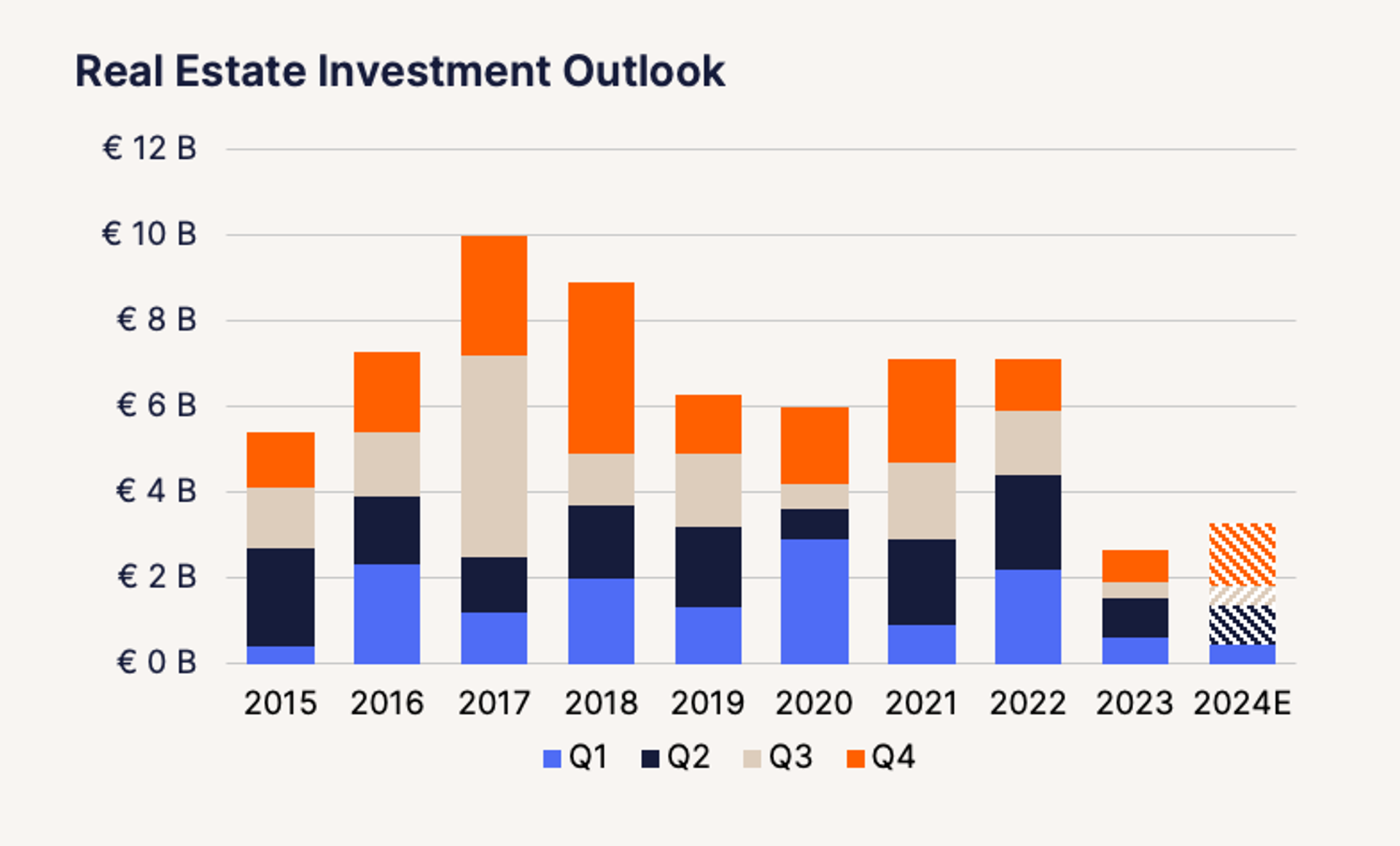 Recent forecasts suggest that the European Central Bank's policy rate will tick lower from summer onwards. The availability and price of debt capital has constrained real estate transactions for almost two years. While lenders are not expected to ease their conditions in the coming months, the outlook improves towards the end of the year as interest rates fall.