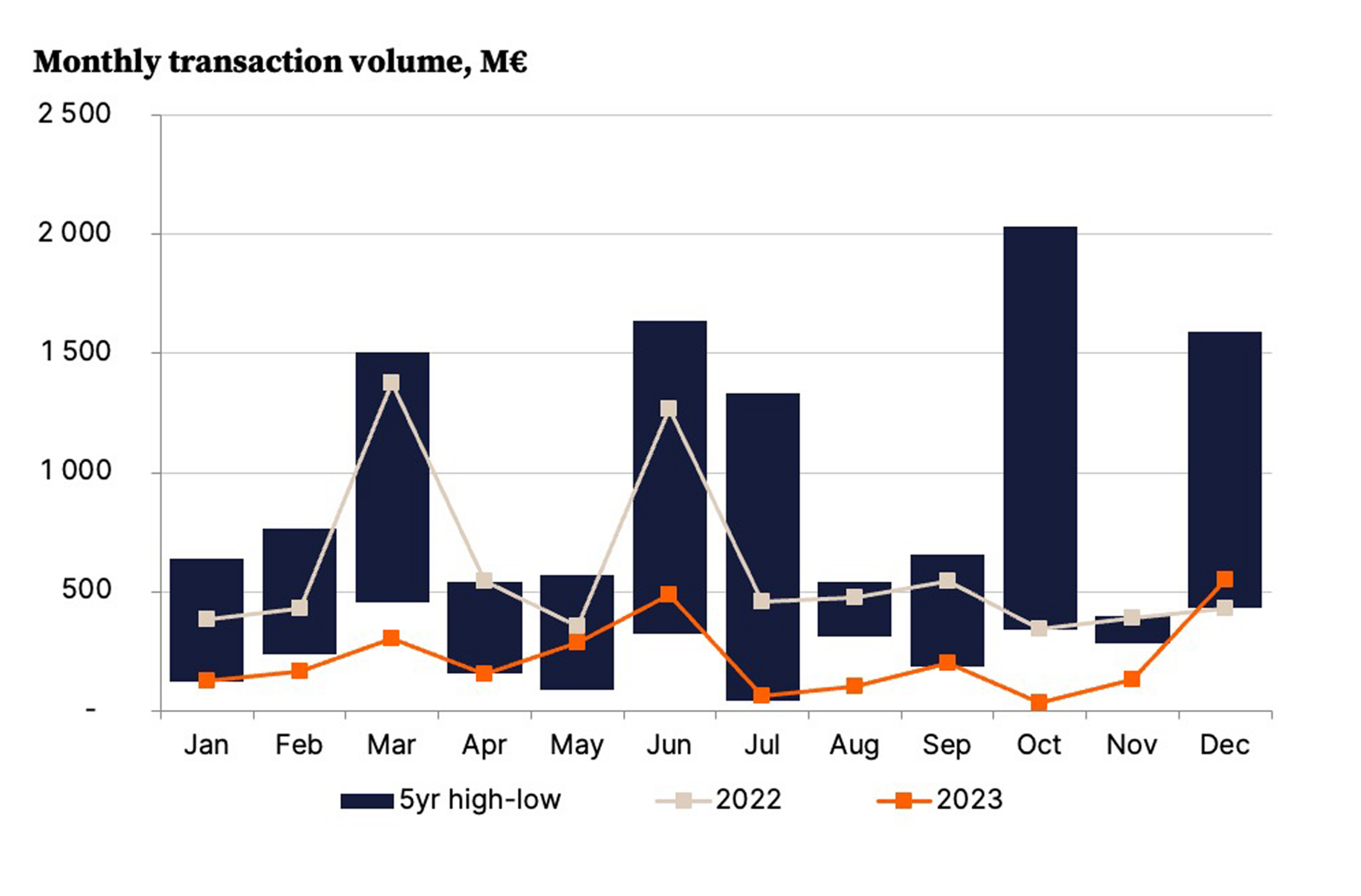Of the full year, Q3 was the lowest in terms of transaction volume (EUR 383 million). The last quarter of the year saw more activity in the investment market with EUR 696 million, and December had the biggest monthly transaction volume in 2023 with EUR 550 million, also being the most active single month in the past 15 months.