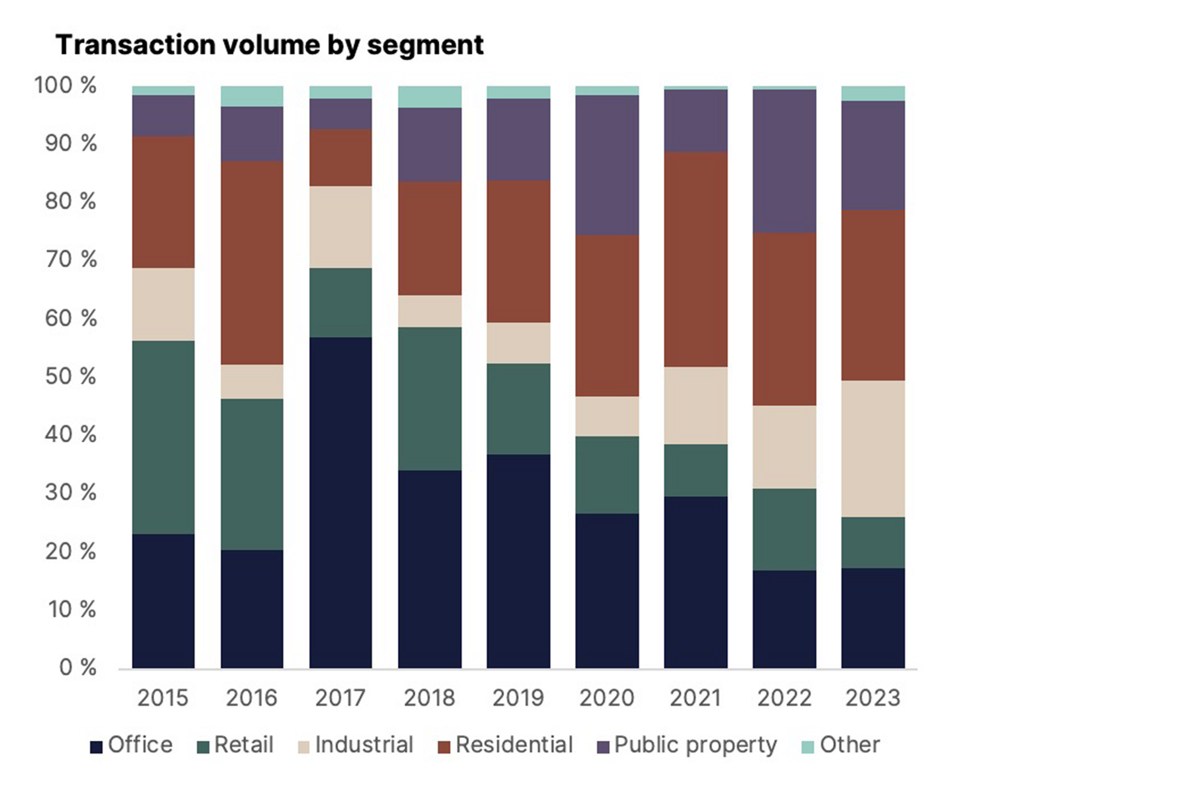 The largest segment in terms of transaction volume in 2023 was residential with EUR 758 million (-62% YoY), accounting for 29% of the total volume. Logistics full year volume was EUR 609 million (-39% YoY), public properties EUR 486 million (-72% YoY), offices EUR 453 million (-62% YoY), retail EUR 224 million (-77% YoY) and other segments EUR 66 million (+79% YoY).