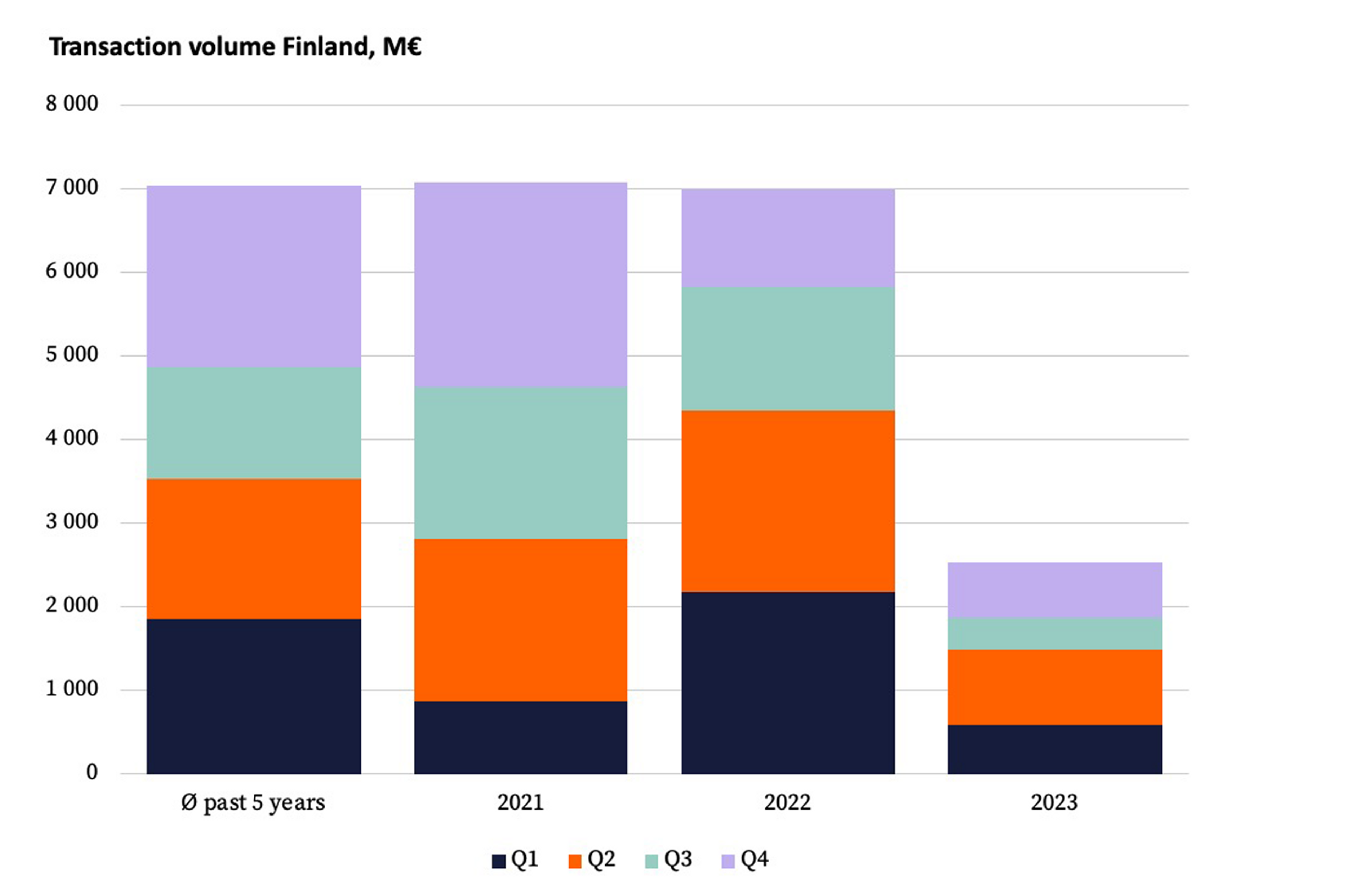 Activity in the Finnish real estate investment market remained exceptionally low in 2023. Much of the investment activity was characterized by the ever-evolving financing costs, and with that the repricing process. In turn, the transaction activity has suffered.