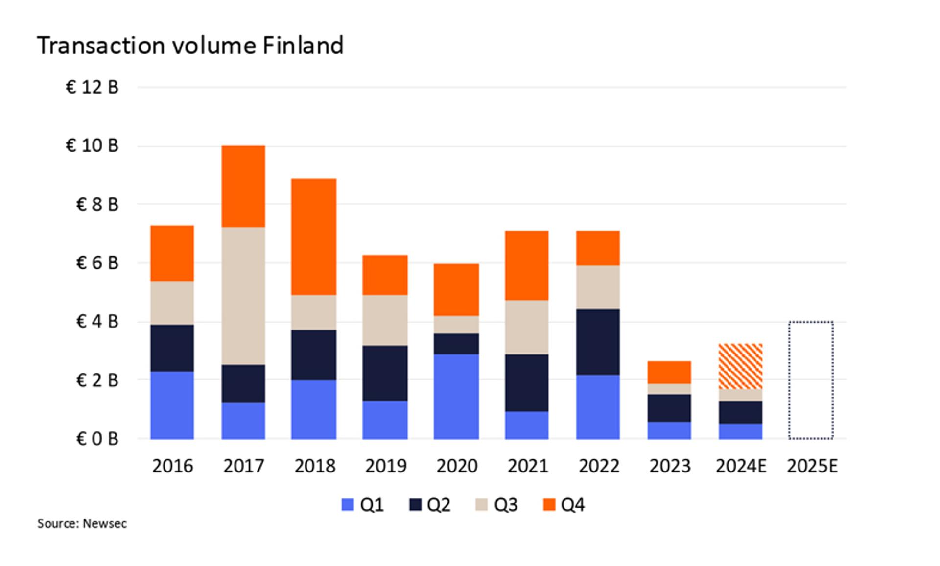 - In Q1-Q3 2024, Finland's transaction volume was 1.6 billion euros, representing a 16% decrease compared to the same period in 2023. Financing costs and pricing view differences continue to affect transactions, but the situation appears to be easing as the interest rates decline.