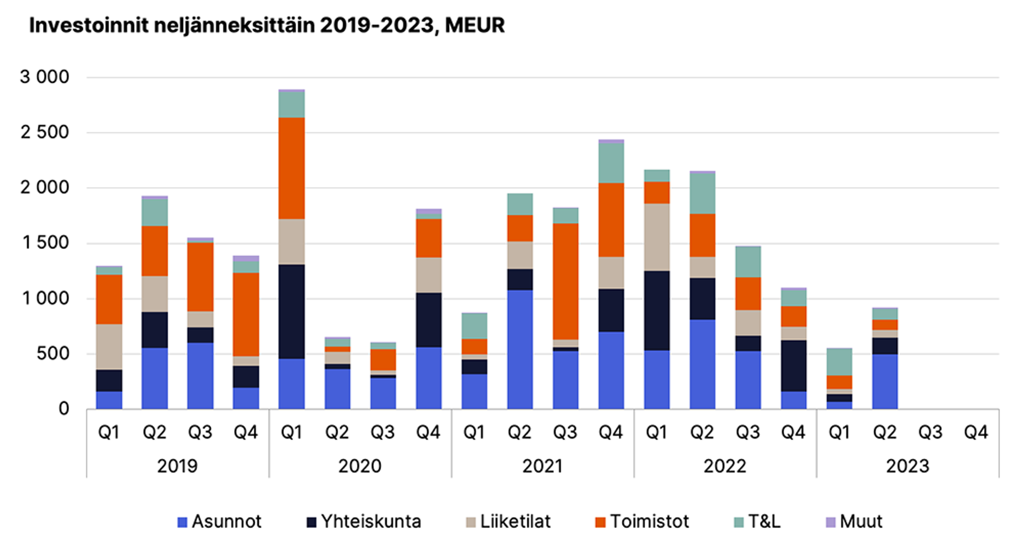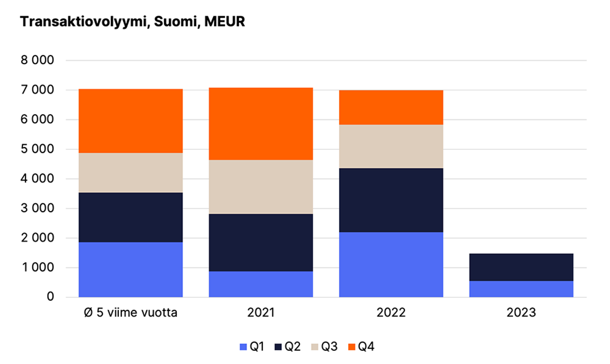 Toisen vuosineljänneksen kiinteistökaupanvolyymi oli noin 920 miljoonaa euroa ja vuoden 2023 ensimmäisen vuosipuoliskon volyymi oli noin 1,5 miljardia euroa. Edellisten viiden vuoden keskiarvo toisella neljänneksellä on noin 1,7 miljardia euroa ja noin 3,5 miljardia euroa ensimmäisellä vuosipuoliskolla.