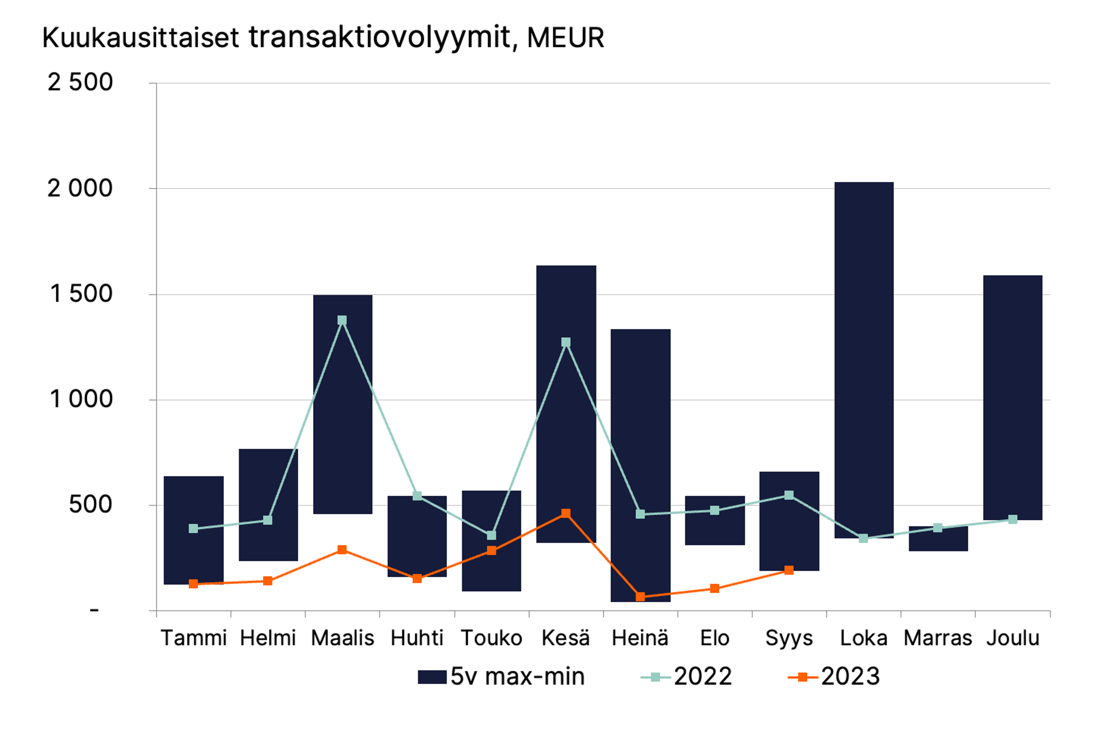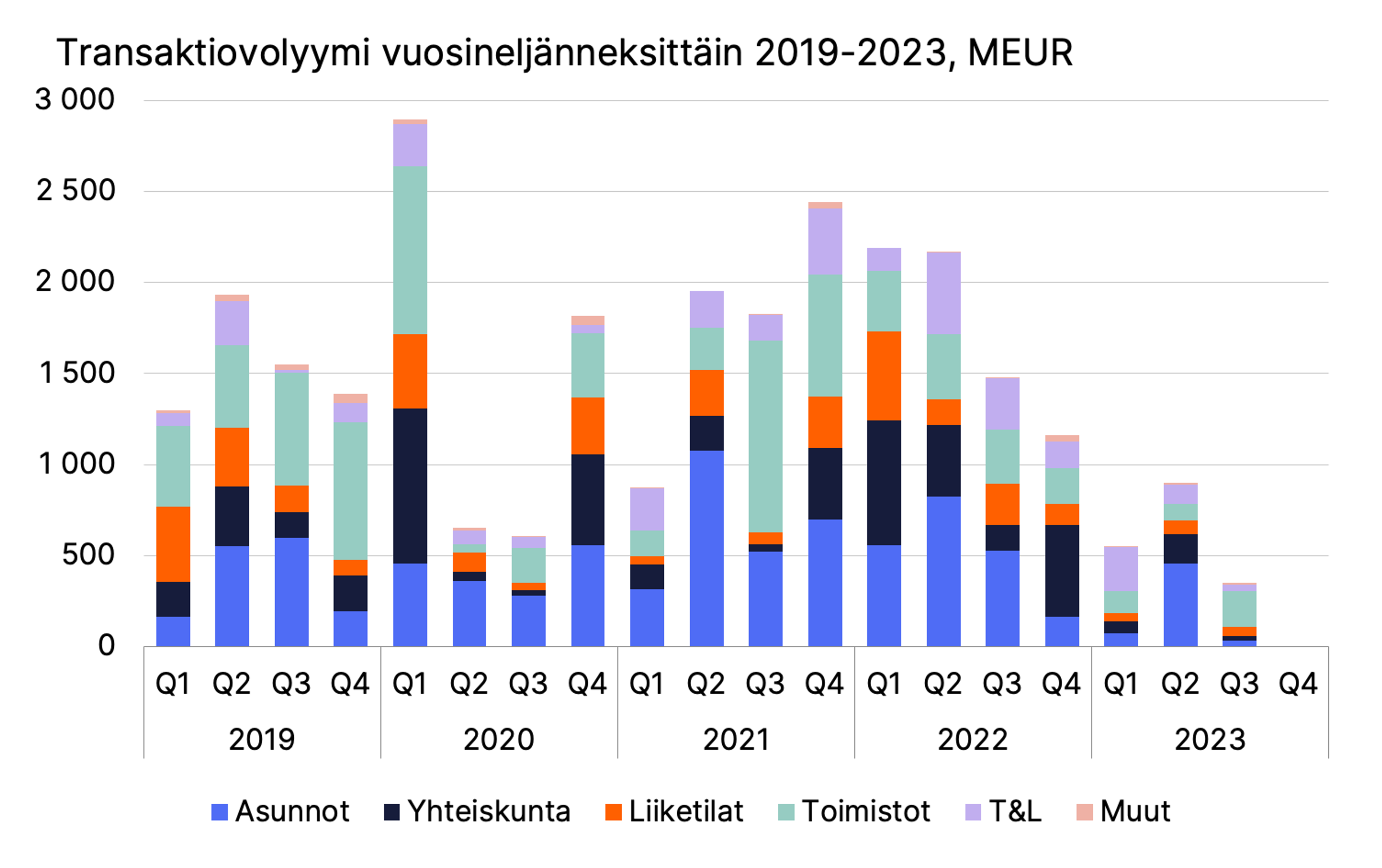 Kolmannen vuosineljänneksen kiinteistökaupanvolyymi oli noin 352 miljoonaa euroa ja vuoden 2023 transaktiovolyymi noin 1,8 miljardia euroa. Edellisten viiden vuoden keskiarvo kolmannella neljänneksellä on noin 1,3 miljardia euroa.