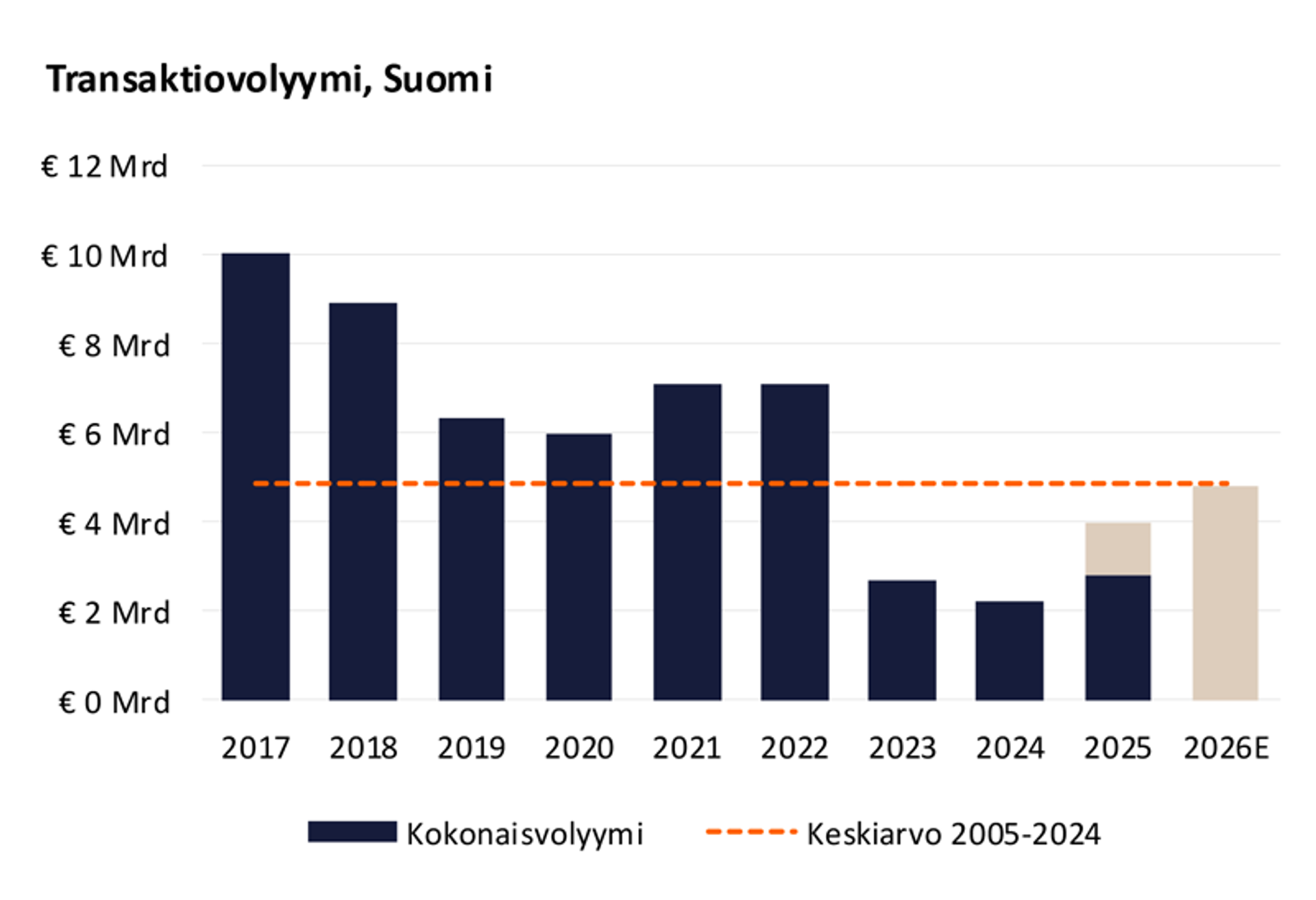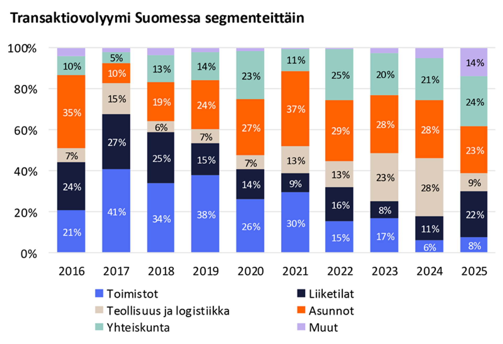 - Vuonna 2025 Suomessa transaktioita on tehty etenkin yhteiskuntakiinteistöjen, liiketilojen ja asuntojen segmenteissä.
