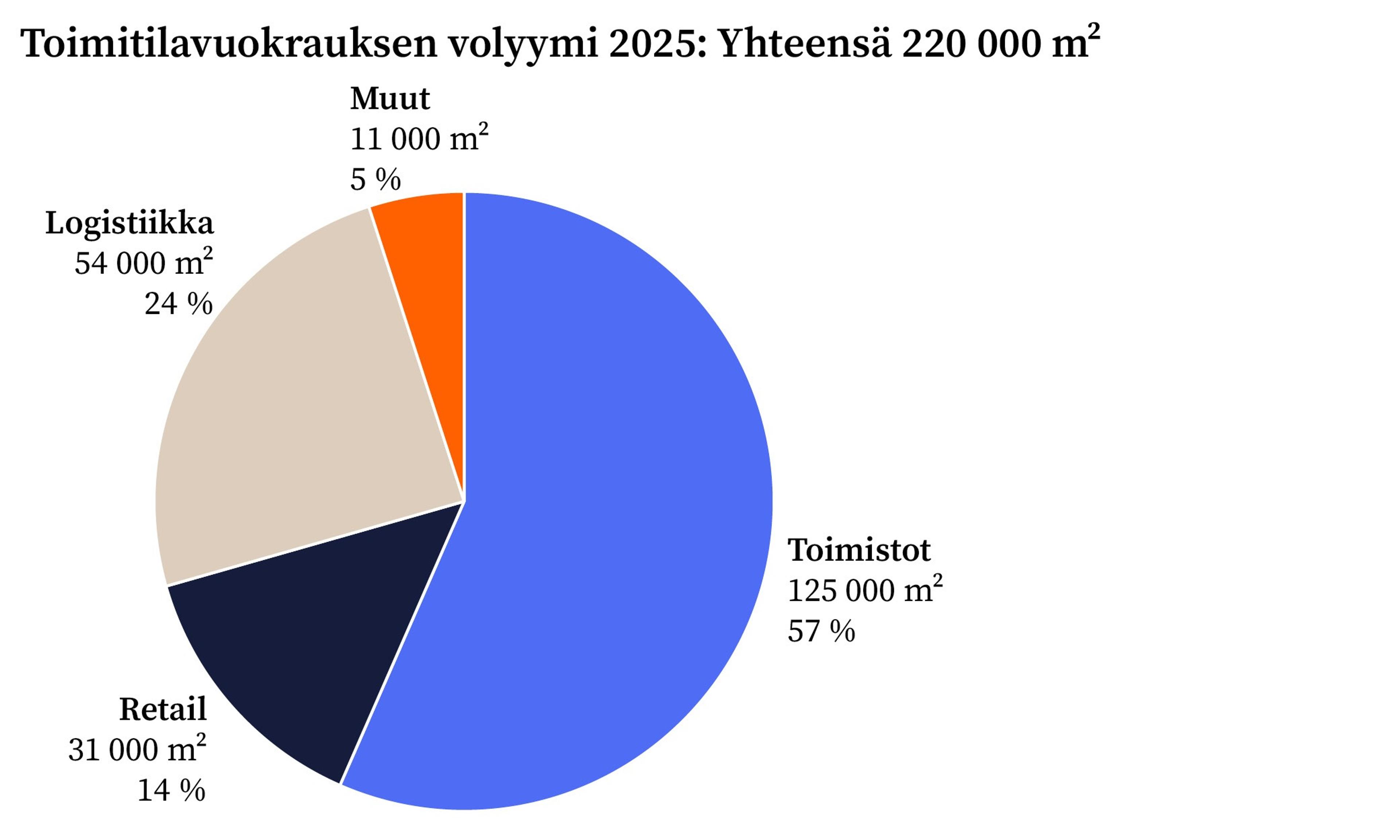 Toimistojen uudisvuokrauksessa tapahtui ilahduttavaa kehitystä: ensimmäistä kertaa koronapandemian jälkeen uudisvuokrattujen toimistojen keskikoko kääntyi kasvuun. Vuonna 2025 uudisvuokrattujen toimistojen keskikoko oli noin 380 m², kun edellisvuonna vastaava luku oli noin 250 m². Kun keskikoossa huomioidaan myös sopimusten uusinnat, oli toimistovuokrasopimusten keskikoko yli 660 m² vuonna 2025.