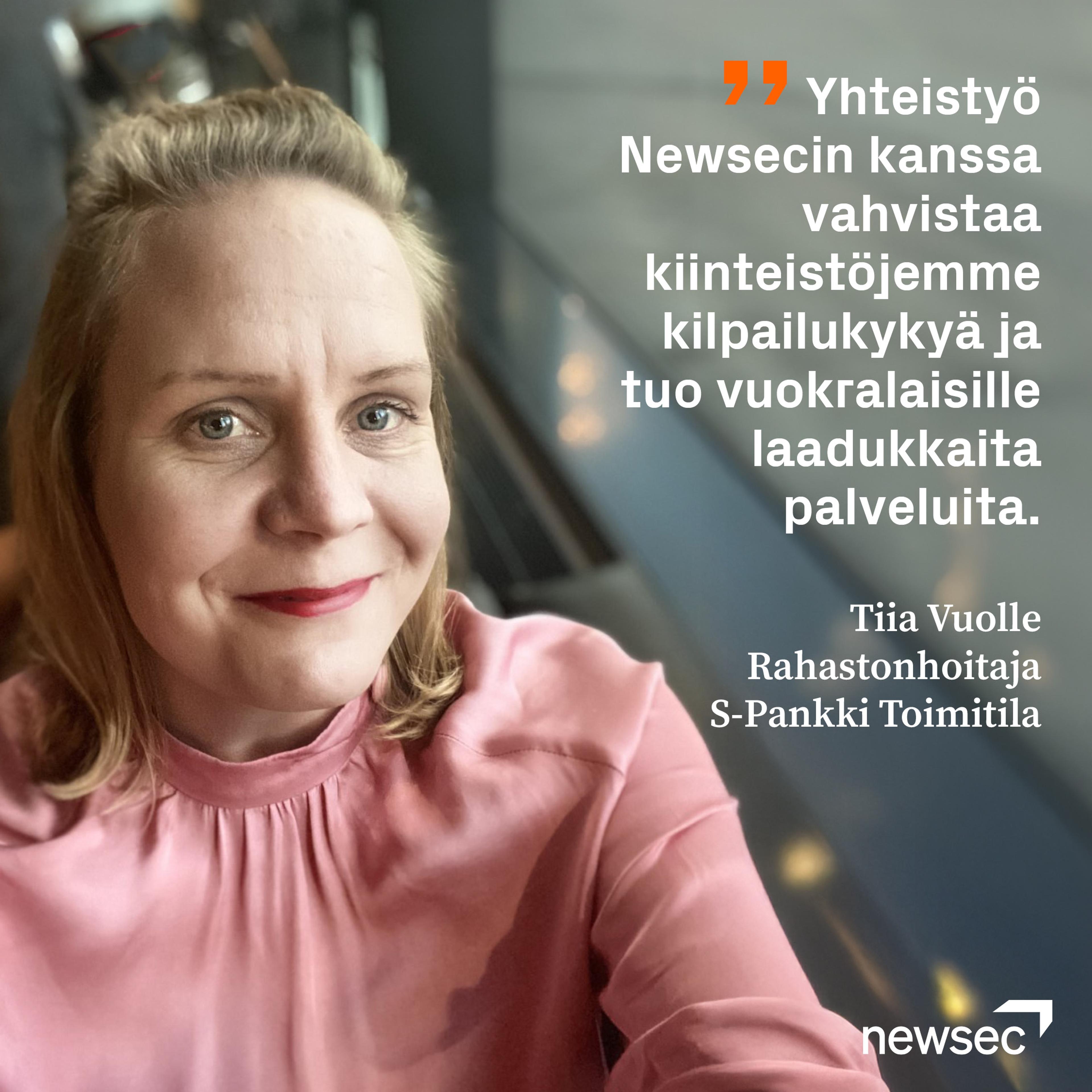 ”Tavoitteenamme oli löytää kumppani, joka pystyy kehittämään kiinteistöportfoliomme arvoa ja tarjoamaan vuokralaisillemme laadukkaita palveluita. Newsecin ammattitaitoinen ja asiakaslähtöinen toimintatapa vakuutti meidät. Yhteistyö tukee tavoitteitamme ja vahvistaa kiinteistöjemme kilpailukykyä muuttuvassa markkinassa”, toteaa S-Pankki Toimitila Erikoissijoitusrahaston rahastonhoitaja Tiia Vuolle.