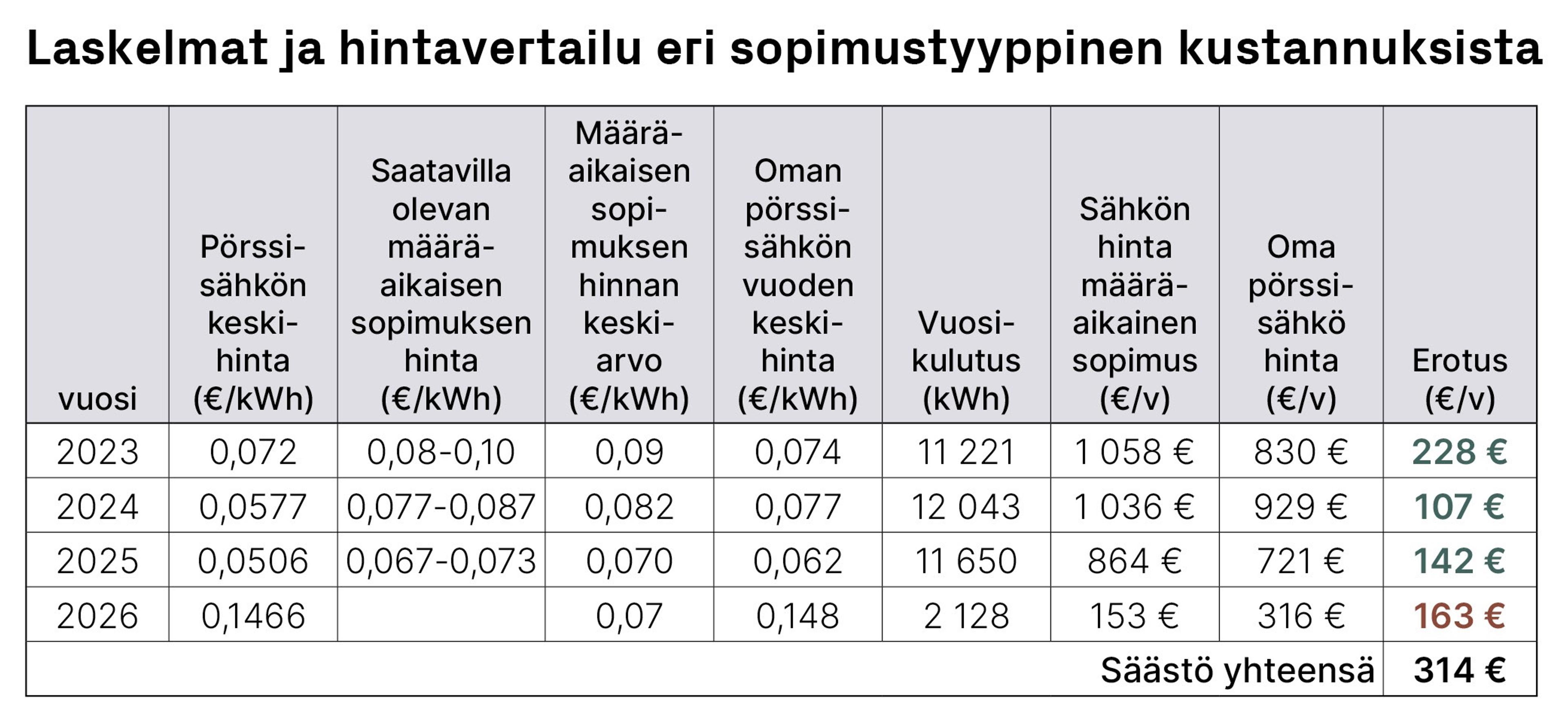 Kävin läpi sähkölaskumme viimeisen 3 vuoden ajalta ja vertaisin maksamaamme pörssisähkön hintaa kyseisen vuoden kesällä saatavilla olevaan yhden vuoden määräaikaisen sähkösopimuksen hintaan. Otin vertailuun mukaan myös tammikuun 2026.