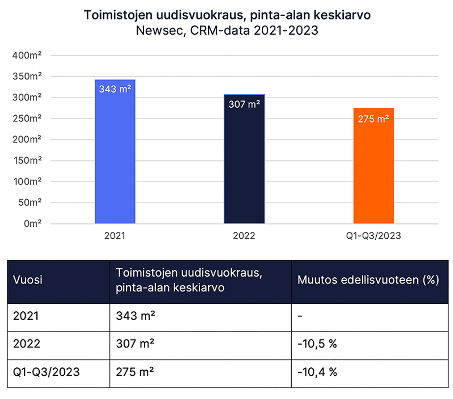Commercial Leasing -vuokraustiimin CRM-datan perusteella toimistojen uudisvuokrauksen keskiarvoinen tilakoko on pudonnut alle kolmensadan neliön vuoden 2023 aikana, kun vielä vuonna 2021 uudisvuokrauksessa keskiarvoinen toimistopinta-ala oli yli 340 m². Uusia tiloja etsivät yritykset hakeutuvat keskimäärin pienempiin toimistotiloihin kuin aiempina vuosina.