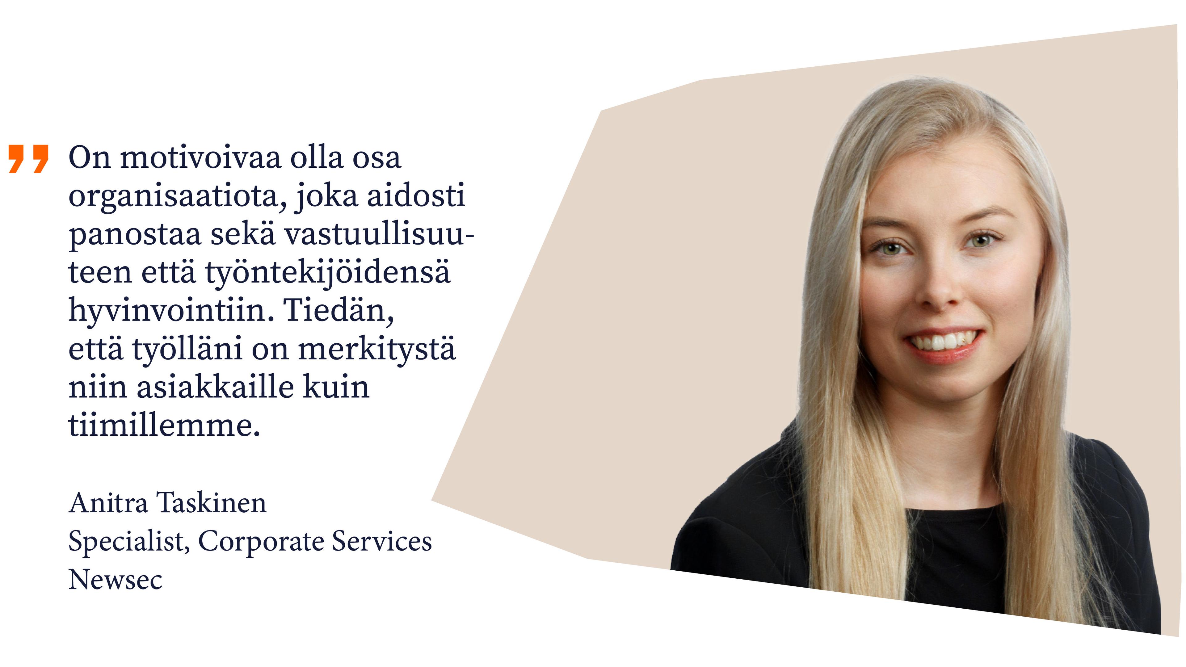 Anitra Taskinen on työskennellyt Newsecillä vuodesta 2022 hallinnon asiantuntijana osana Legal & Compliance -yksikön Corporate Services -tiimiä. Hän vastaa asiakkuuksiensa yhtiöiden hallinnoinnista – työstä, jossa vastuullisuus näkyy konkreettisesti arjen toimintatavoissa ja kestävissä päätöksissä.