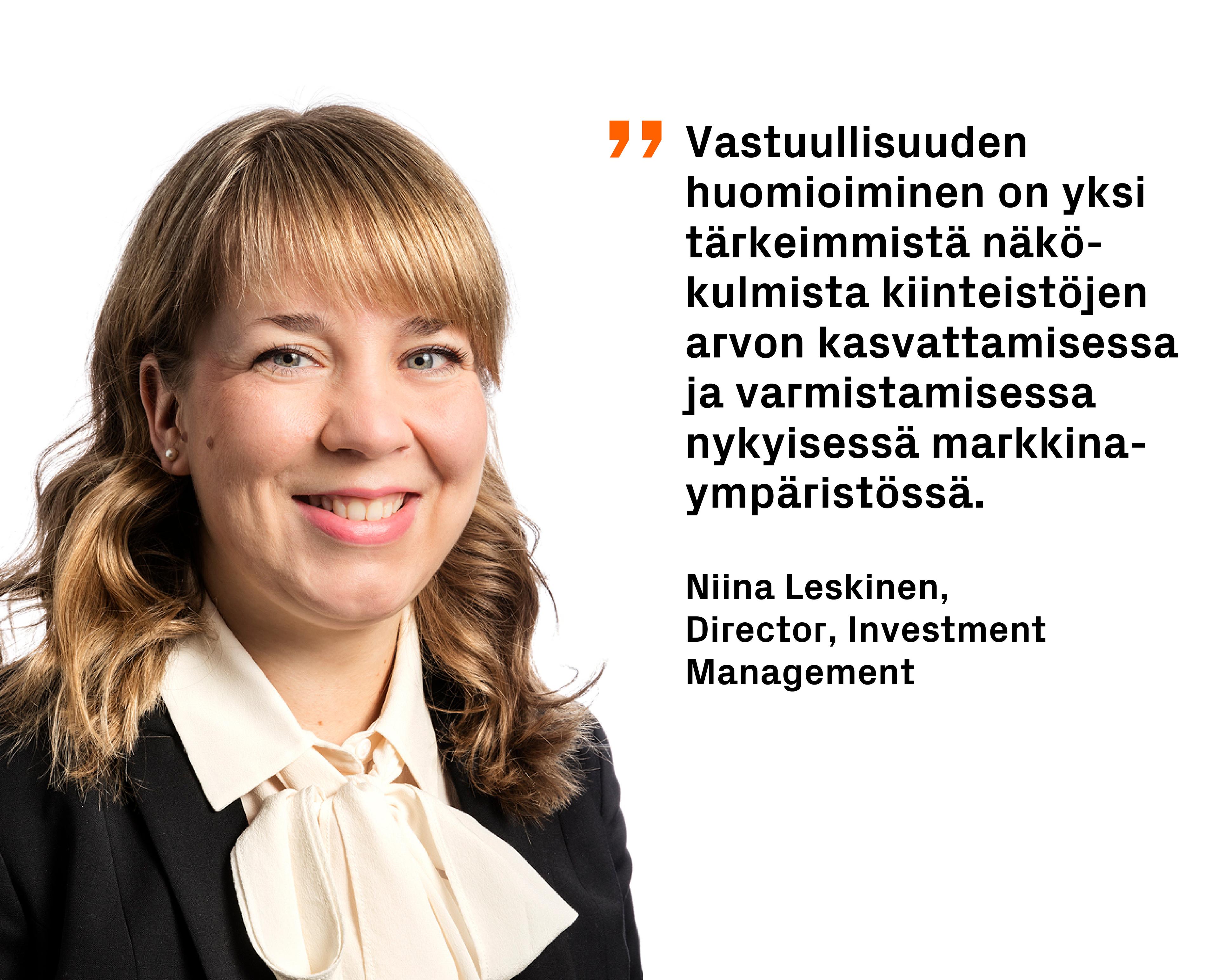 Niina Leskinen vastaa Investment Managementin Director-roolissa nimetyistä rahastoista, sekä rahastojen Suomessa omistamista kiinteistöistä ja niiden jatkuvasta kehittämisestä. Kohteiden omistusaikana hän osallistuu salkkujen ja kohteiden vastuullisuuden tiekartan laatimiseen ja varmistaa, että asiakkaan tavoitteet tulevat huomioitua. Hän myös toteuttaa vastuullisuustoimenpiteiden seurantaa ja raportointia asiakkaalle yhteistyössä kollegoidensa kanssa sekä ideoi yhdessä kollegoiden kanssa, minkälaisia investointeja kohteisiin tulisi tehdä.