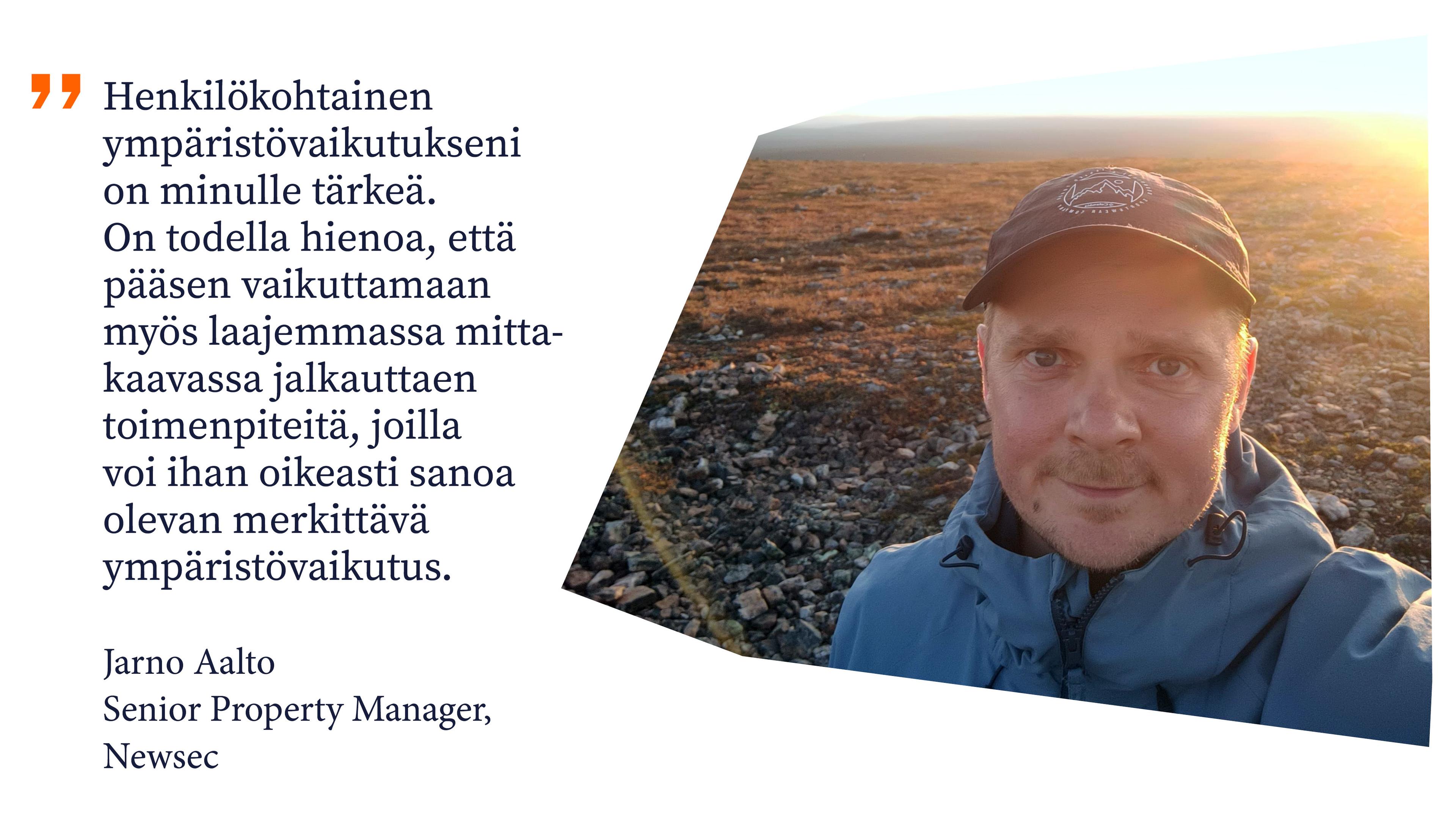 Jarno Aalto on työskennellyt Newsecillä vuodesta 2019, ja vastannut alusta saakka asiakkaamme kahdeksasta kiinteistökohteesta kiinteistöpäällikön roolissa. Kohteet sijaitsevat Helsingissä ja yksi logistiikkakiinteistö Vantaalla. Kohdesalkussa on hotellia, terveysasemaa, logistiikkakohdetta, vahvasti Museoviraston suojelemaa kiinteistöä, keskustan arvokiinteistöä sekä modernia liikekiinteistöä.