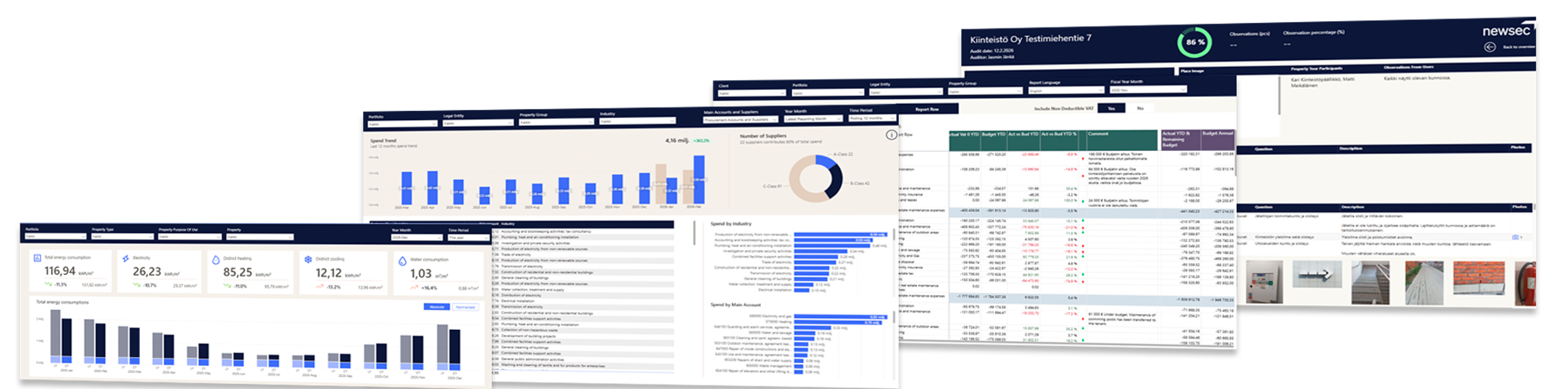 Kiinteistökohtaiset, kiinteistötyyppien mukaiset ja portfoliotasoiset raportit mahdollistavat vastuullisen johtamisen ja tuottojen optimoinnin. Selkeä vertailu ja trendien tunnistaminen yhdessä säännöllisten toimenpide-ehdotusten kanssa tukevat strategiaasi ja auttavat kehittämään salkkua tehokkaasti.