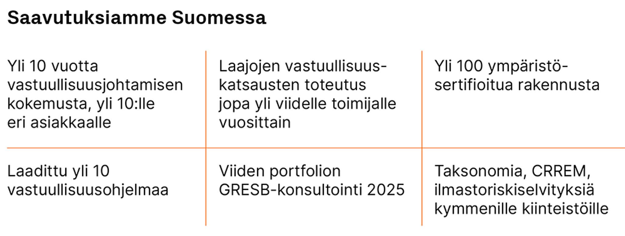 Asiantuntijamme auttavat vastuullisuuden johtamisessa ja kehittämisessä. Neuvomme kiinteistön omistajia, varainhoitajia ja vuokralaisia koko kiinteistön elinkaaren ajan - kiinteistön hankinnasta sen hallintaan ja myyntiin asti.